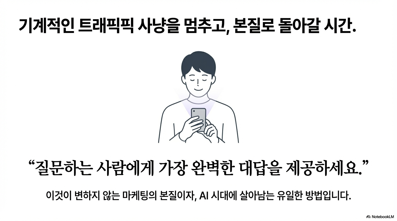 기계적인 트래픽 사냥을 멈추고, '질문하는 사람에게 가장 완벽한 대답을 제공한다'는 마케팅의 본질로 돌아갈 때입니다.