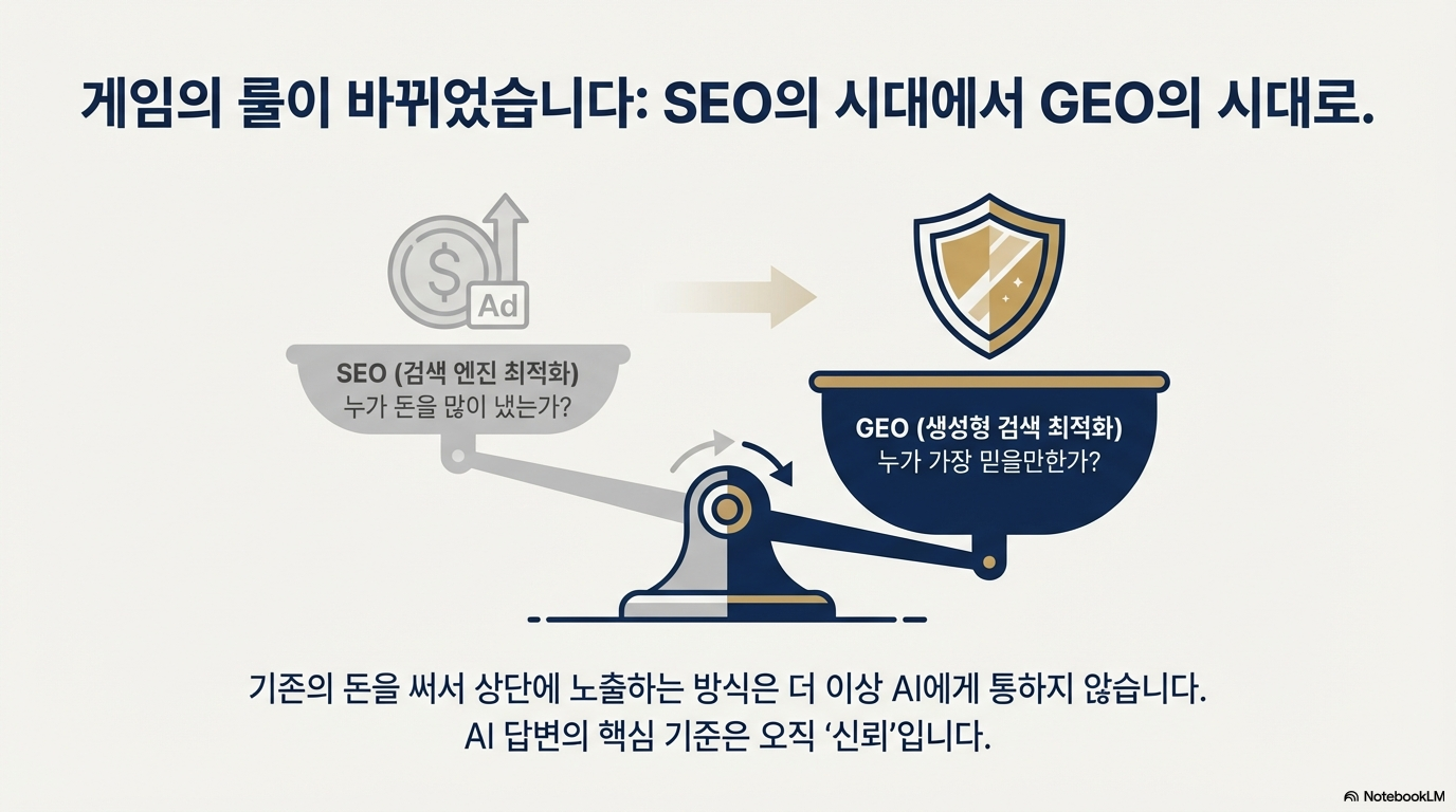 광고비로 검색 결과의 한 자리를 살 수는 있지만, AI의 답변 속에 들어가는 권위를 살 수는 없습니다.