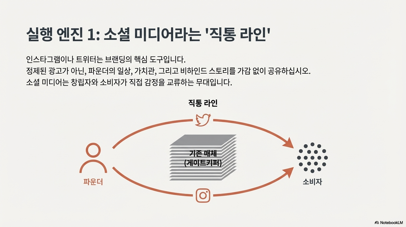오늘날 소셜 미디어는 브랜딩의 중요한 도구가 되었습니다. 파운더가 직접 소셜 미디어에 나서서 자신의 이야기를 공유하고, 소비자와 소통할 수 있는 기회를 가지는 것이 중요합니다. 소셜 미디어 플랫폼을 통해 파운더의 일상적인 모습, 가치관, 그리고 브랜드에 대한 비전을 공유함으로써, 소비자와의 관계를 더욱 강화할 수 있습니다.