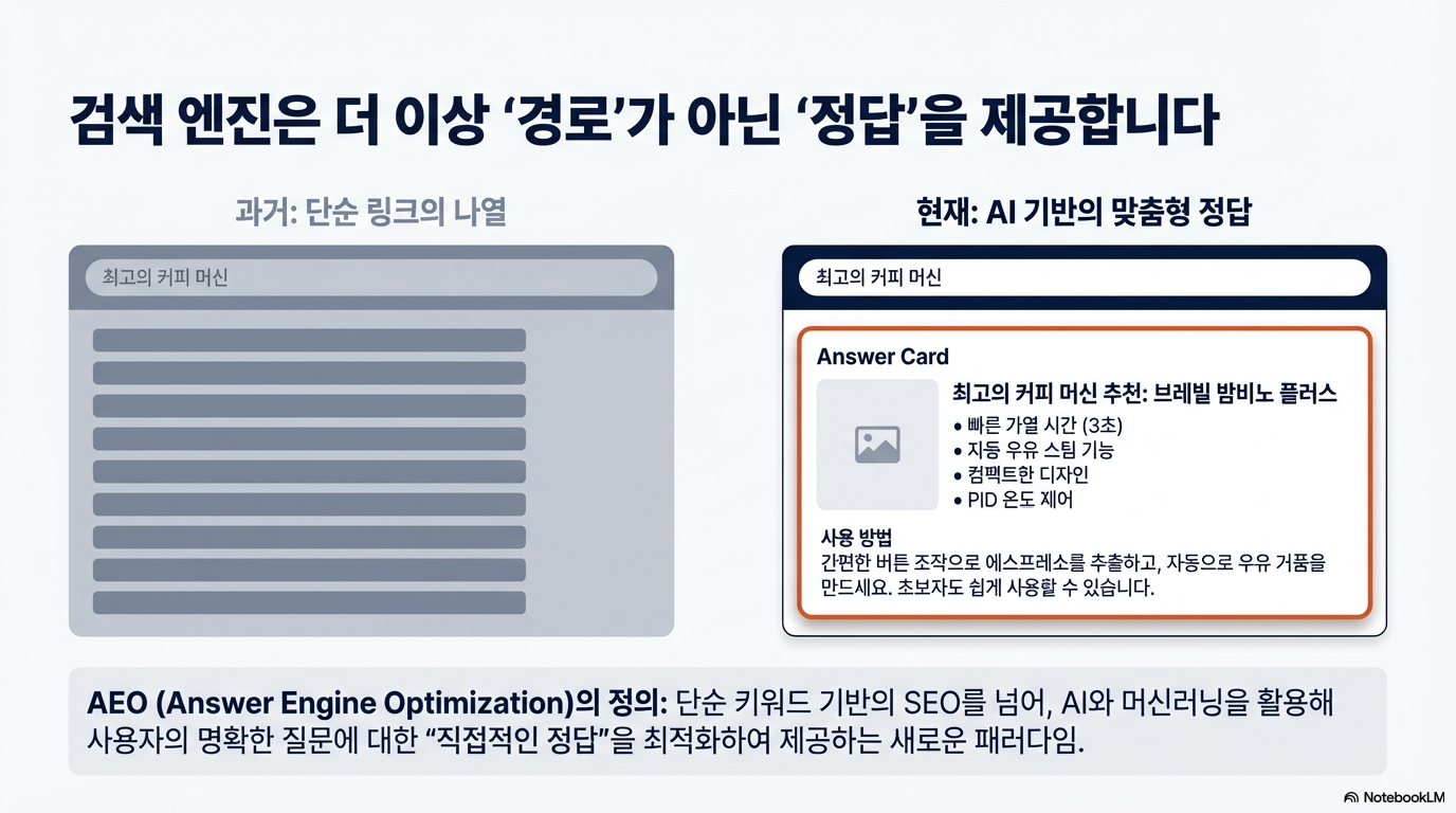 AEO(Answer Engine Optimization)는 검색 엔진 최적화의 새로운 패러다임으로, 단순히 키워드에 기반한 SEO를 넘어 사용자의 질문에 대한 정확한 답변을 제공하는 데 중점을 두고 있습니다. 이는 검색 엔진의 알고리즘이 발전함에 따라, 사용자가 정보를 검색할 때 더 이상 단순한 링크 클릭을 원하지 않고, 직접적인 답변을 찾고 있다는 점에서 중요성이 커졌습니다. AEO는 AI와 머신러닝 기술을 활용하여 사용자의 의도를 파악하고, 그에 맞는 정보를 제공하는 방식으로 발전하고 있습니다.